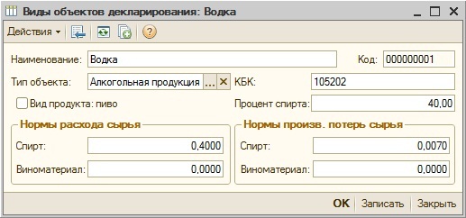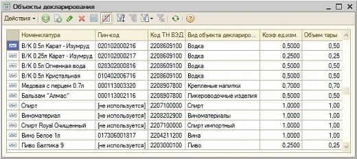В декларациях номенклатурные позиции отражаются по кодам бюджетной классификации (КБК). Справочник «Виды объектов декларирования» содержит наименования видов алкогольной продукции и КБК, по которым номенклатура будет отражаться в декларациях. Каждому виду объекта декларирования в соответствие может быть установлено любое количество номенклатурных позиций, и при формировании деклараций, данные по ним будут свернуты в одну строку в соответствии с их КБК и кодом ТН ВЭД.