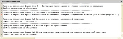 Для работы с отчетами используются механизмы, общие для большинства регламентированных отчетов типовой конфигурации «Бухгалтерия для Казахстана». В дополнение к обычным функциям, реализована функция проверки заполнения отчетов. Числовые поля (например, КБК, Код ТН ВЭД) проверяются на наличие нечисловых символов, а текстовые поля – на наличие запрещенных символов, наличие которых может вызвать ошибку загрузки в приложение Декларанта. Если обнаружены ошибки заполнения, то выводится список таких ошибок.