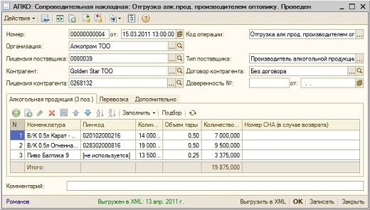 В конфигурации предусмотрена возможность автоматического формирования сопроводительных накладных на основании первичных бухгалтерских документов на отгрузку алкогольной продукции.