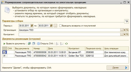Формирование документов автоматизировано. С помощью специальной обработки «Формирование сопроводительных накладных» можно выбрать документы на отгрузку алкогольной продукции и автоматически ввести по ним сопроводительные накладные.