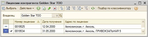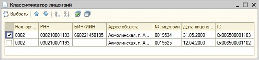Доступен подбор лицензий контрагентов или организаций из Классификатора лицензий. Подбор осуществляется по РНН или ИИН/БИН контрагента/организации.