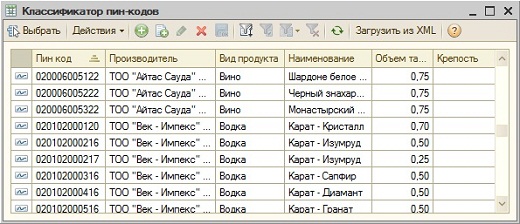 Поиск Пин-кодов можно осуществлять по производителю, виду продукта и наименованию. Классификатор Пин-кодов загружается из файла формата XML, который публикуется на FTP-ресурсе Налогового комитета по адресу ftp://ftp.salyk.kz/SONO/SNA/Spr/alco.zip