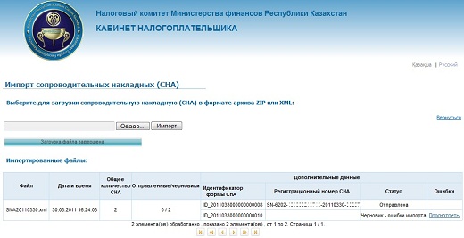 Далее сопроводительные накладные можно выгружать в файл формата XML. Выгрузку можно осуществлять как по одному документу, так и сразу группой. Для групповой выгрузки СНА в файл формата XML используется режим выгрузки обработки «Формирование сопроводительных накладных». После выгрузки СНА в файл формата XML, можно импортировать данный файл в журнал регистрации СНА «Кабинета налогоплательщика». Если все сопроводительные накладные были заполнены корректно, то сразу после импорта, СНА будут автоматически отправлены получателю. Если же в сопроводительных накладных будет недоставать некоторых данных, они будут загружены в «Кабинет налогоплательщика» в статусе «Черновик», можно будет посмотреть описание ошибки и внести соответствующие исправления непосредственно в Кабинете налогоплательщика.