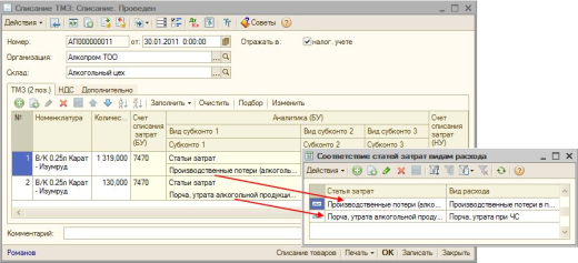 При проведении документа списания программа обращается к этому регистру сведений и определяет вид расхода по статье затрат, указанной в аналитике затрат списания.