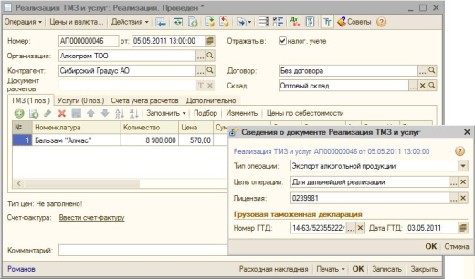 Если Пин-кода будут выбраны для объектов декларирования, а для контрагентов будут зарегистрированы лицензии подбором из классификатора лицензий, то в сопроводительных накладных при вводе на основании бухгалтерских документов отгрузки будут заполнены практически все данные. Пользователю останется только занести сведения о перевозке и доверенность получателя (если есть).