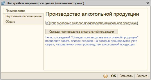 Если эта опция включена, в регистр сведений «Склады производства алкогольной продукции» заносится перечень складов, на которых хранятся запасы спирта и/или виноматериала, предназначенные для производства алкогольной продукции.